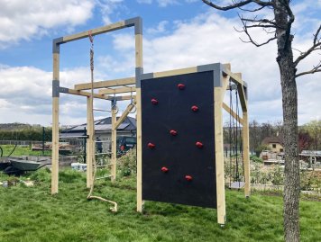 Zábava pro děti s houpačkou, žebřinami, hrazdou na výmyk, boulderem a šplhem. Nechybí ručkovací žebřík s kruhy a hrazda na shyby pro rodiče či pozdější posilování odrostlých dětí. Sestava je bezbarvě impregnována a majitelé si ji natřou lazurou odstínu dle vlastní preference. Rozměry sestavy jsou 2,5 x 4 m.