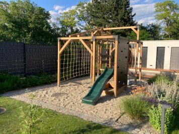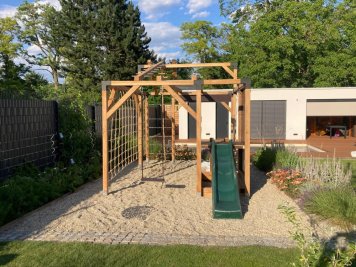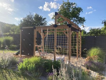 Dvouletý syn se dočkal houpačky, skluzavky, pod níž se schovává pískoviště. Užije si také lezeckou stěnu i provazovou síť. Platforma, ze které se nastupuje na klouzačku, je namontována tak, aby šla za pár let jednoduše odejmout a její místo mohly nahradit ještě další zábavné prvky.