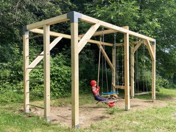 Ihned po montáži naběhl na hřiště její nový uživatel a oblíbil si ji pro odpočinek také pejsek. Na 2x4 m jsme připravili dvě houpačky - z nich jedna přizpůsobená menšímu dítku - má zábrany. Na bocích je síť a také žebřiny. Ve středu sestavy pak houpací/šplhací lano.