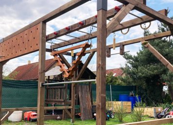 Sestava má rozměr 3x4 m. Osadili jsme ji velkým pegboardem a nízkou hrazdou, velice specifický je závěsný trojúhelník s lištami na náročný trénink ručkování. Nechybí hrazda na přítahy, ručkovací žebřík s lezeckými chyty nacvíc a s přesahem příček do boku pro ručkování pomocí kruhů. Sestava má mnoho prostoru pro další rozšiřování.