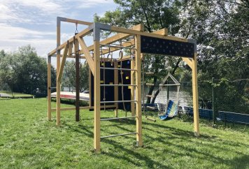 Sestava obsahuje oboustranný boulder (s chyty a s destičkami), hrazdu na výmyk a druhou na shyby, šplhací lano a šplhací kůl "housenka", pegboard, křesílko, žebřiny, ručkovací žebřík a další množství ručkovacích komponentů.