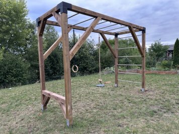 Základní sestavu MINI s žebřinami a kladinou jsme jen vyrobili a zbytek už byl na novém majiteli. Sám si připravil kotvení do země a hřiště pak podle návodu sestavil.